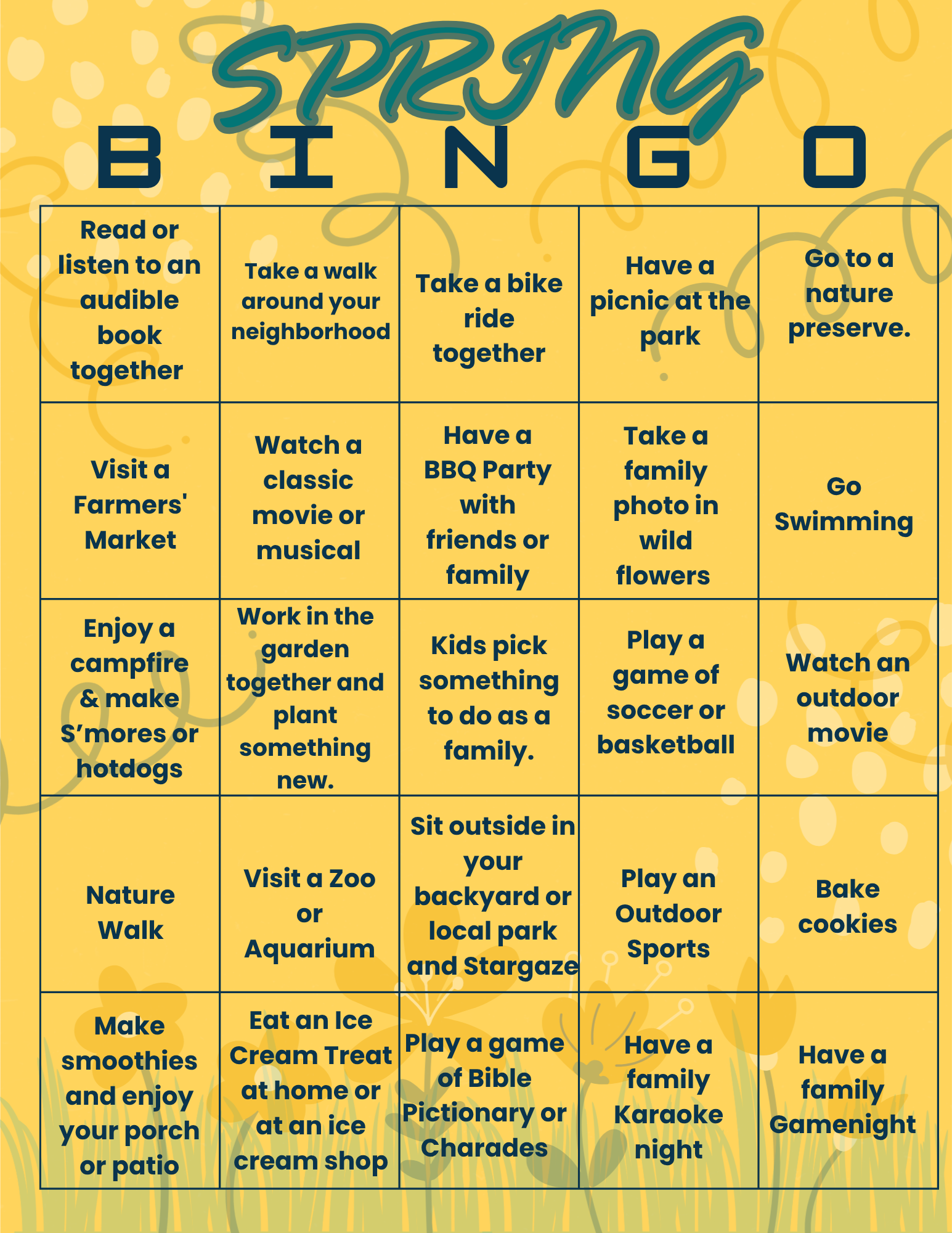 It’s hard to believe we are already in the month of April! Spring season can be a busy season as we finish out the school year with field trips, school performances and spring parties. It can be difficult to carve out family time and sit at the dinner table even once a week. We know the value of family time and want to come alongside you to create memorable moments with your family. We often think we need to take a trip or plan a big family outing for the family, but oftentimes its the small moments we spend together that make a lasting effect and are remembered for years to come. This spring, continue to carve out time for your family to just be together. Perhaps take a night this month to play a board game, bake cookies, watch an old movie, play a game of soccer, or go for a bike ride in your neighborhood. Print or use the Bingo card below for family fun ideas!