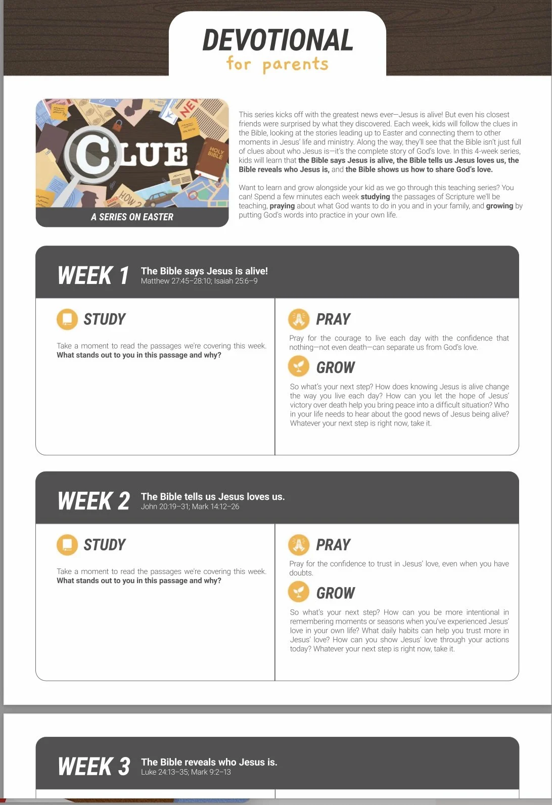 This series kicks off with the greatest news ever—Jesus is alive! But even his closest friends were surprised by what they discovered. Each week, kids will follow the clues in the Bible, looking at the stories leading up to Easter and connecting them to other moments in Jesus’ life and ministry. Along the way, they’ll see that the Bible isn’t just full of clues about who Jesus is—it’s the complete story of God’s love. In this 4-week series, kids will learn that the Bible says Jesus is alive, the Bible tells us Jesus loves us, the Bible reveals who Jesus is, and the Bible shows us how to share God’s love.