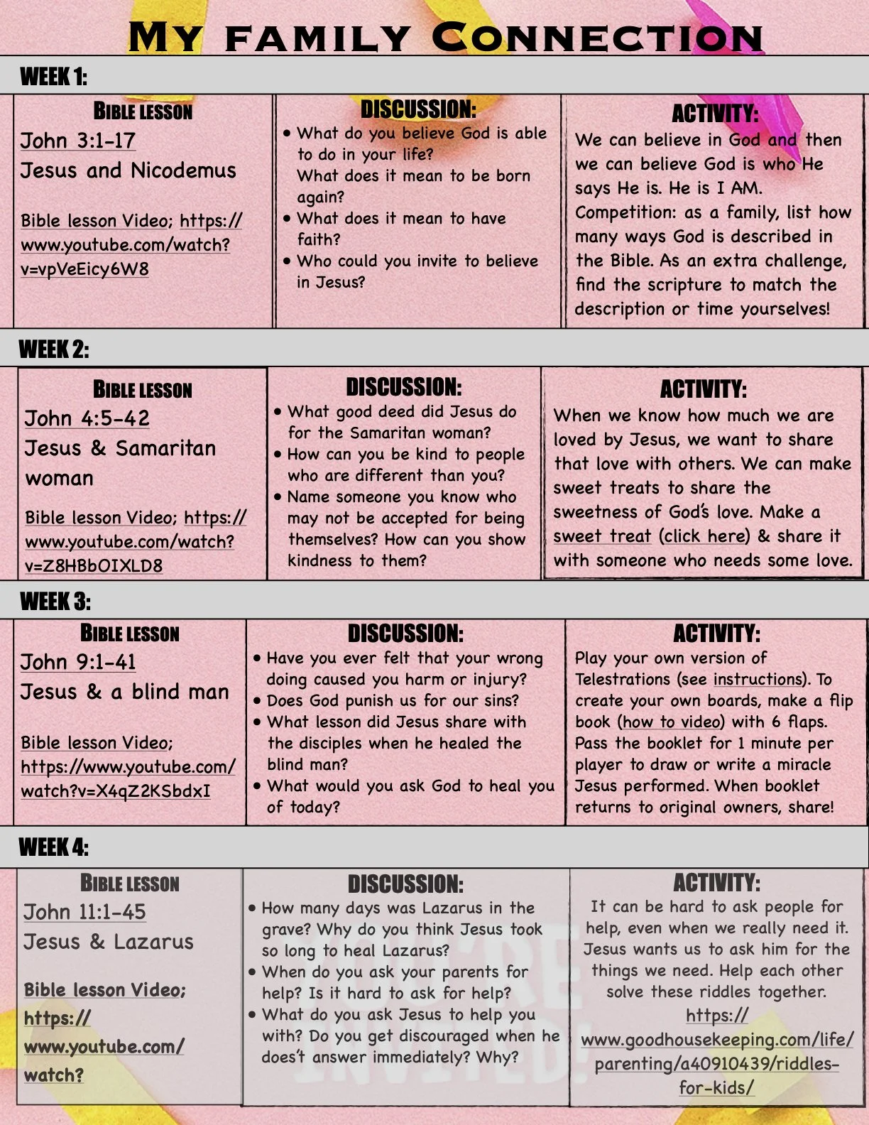 Looking for a way to connect as a family, have a family devotion, and review your child’s Sabbath School lesson? This is a family friendly resource to make your worship and devotion time easy and engaging! Mold this resource page to fit your family time and make family worship a breeze!