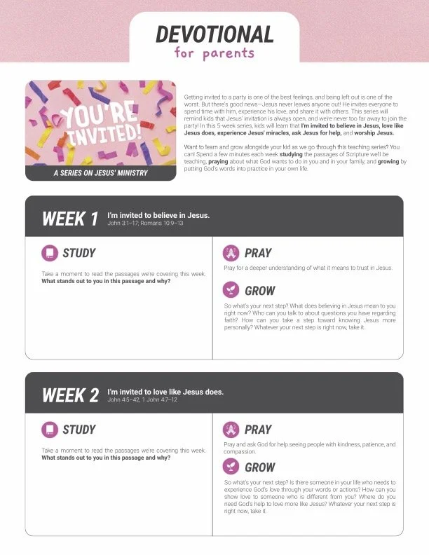 Getting invited to a party is one of the best feelings, and being left out is one of the worst. But there’s good news- Jesus never leaves anyone out! He invites everyone to spend time with him, experience His love, and share it with others. This series will remind us that Jesus’ invitation is always open, and we’re never too far away to join the party! We are… invited to believe in Jesus, Love like Jesus, experience Jesus’ miracles, and ask Jesus for help!