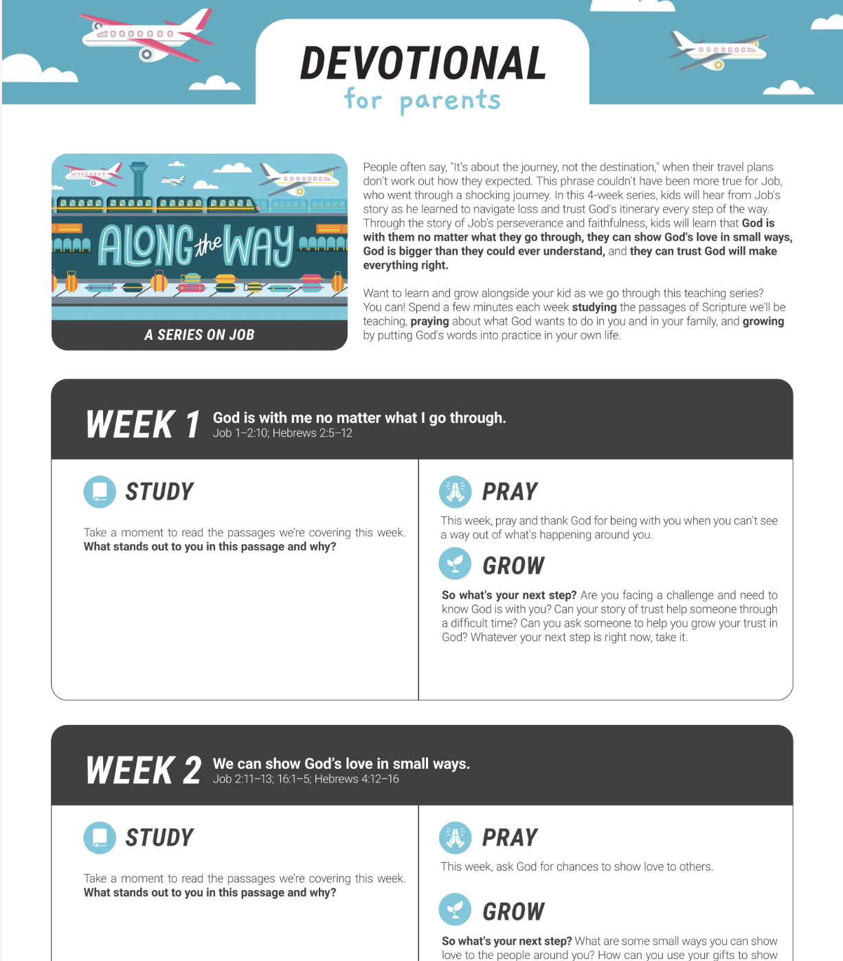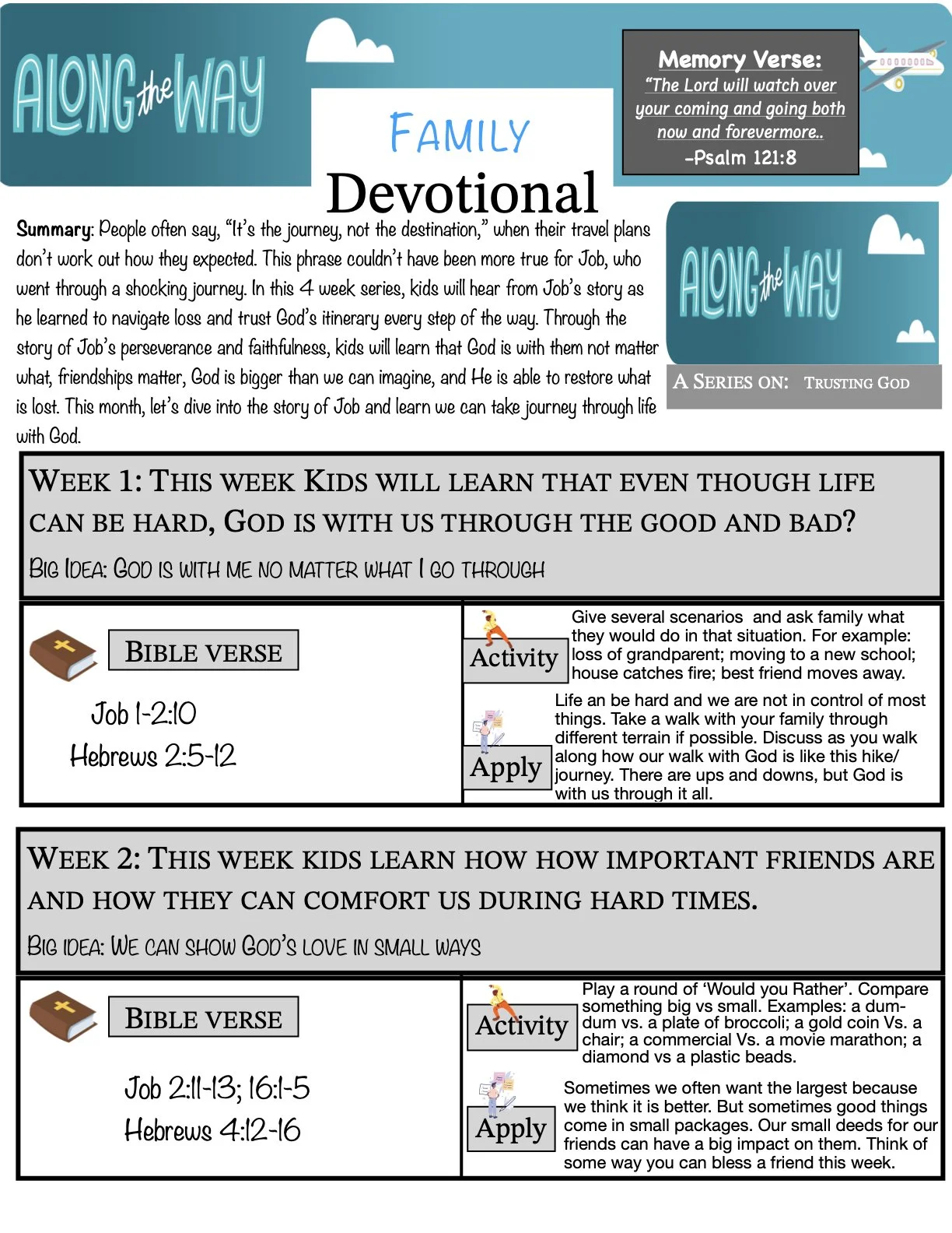 People often say, “It’s about the journey, not the destination,” when their travel plans don’t work out how they expected. This phrase couldn’t have been more true for Job, who went through a shocking journey. In this 4-week series, kids will hear from Job’s story as he learned to navigate loss and trust God’s itinerary every step of the way. Through the story of Job’s perseverance and faithfulness, kids will learn that God is with them no matter what they go through, they can show God’s love in small ways, God is bigger than they could ever understand, and they can trust God will make everything right. This month, take time as a family to understand that our walk with God is a journey. There are ups and downs in life, but God is walking with us every step of the way. We can live in peace knowing that God will never leave us and He wants to go on this journey called life with us!
