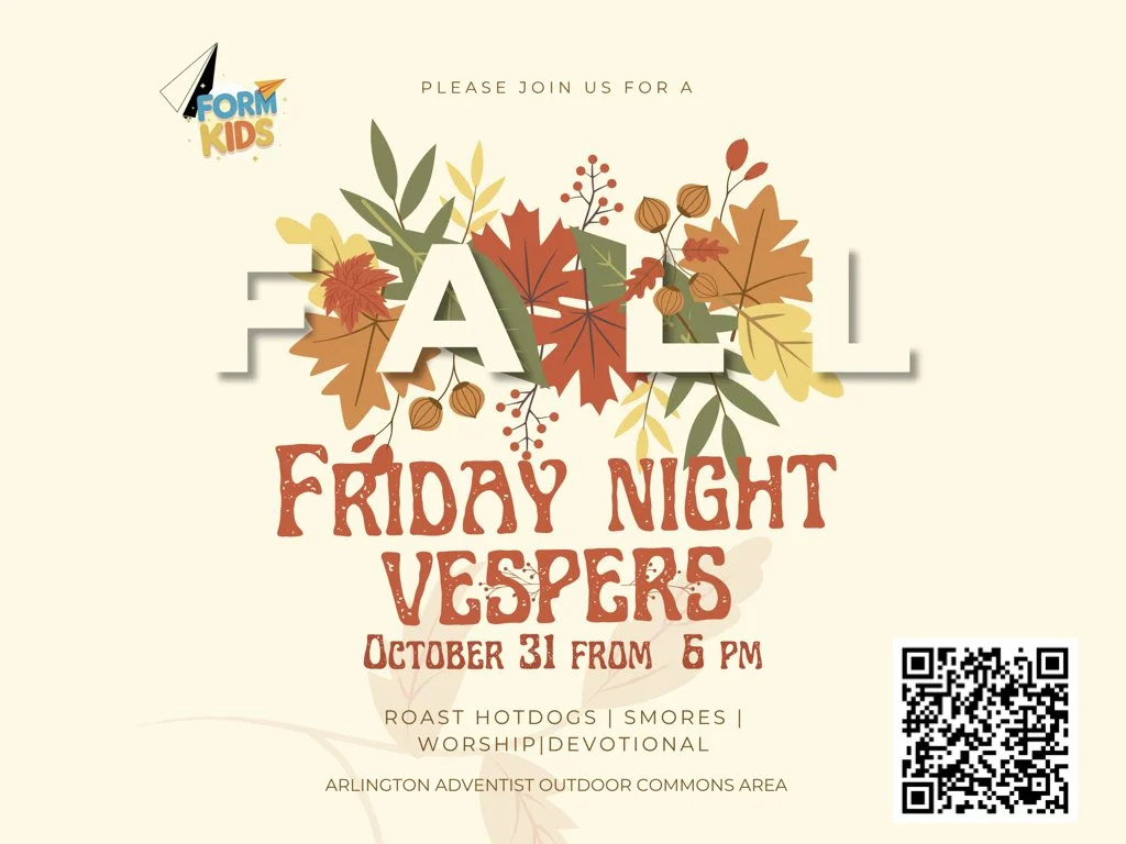Join Arlington Adventist church as we enjoy the cooler weather around a fire. We will roast hotdogs, marshmallows, enjoy S’mores and bring in the Sabbath together with a family worship. Bring your lawn chairs and hopefully a light sweater as we enjoy an evening together filled with fellowship and worship. Registration today!