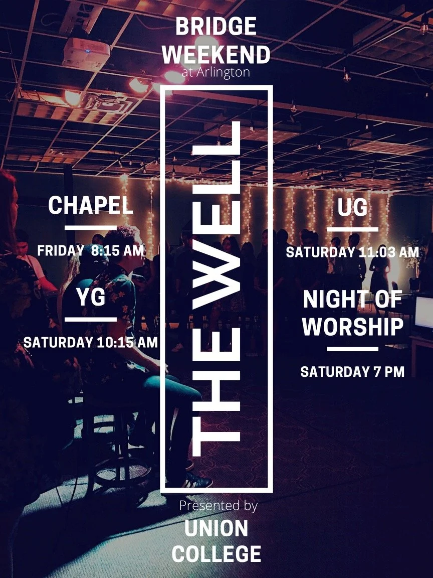 We are thrilled to have another Bridge Weekend coming up featuring “The Well” and our own Zuzu Masina from Union College. It’s great opportunity to invite your student friends from high school and college to enjoy fellowship and inspiration at Arlington Seventh-day Adventist Church! The weekend will culminate with a Night of Worship, Saturday, 7:00PM, at the Underground! Make plans to join us!