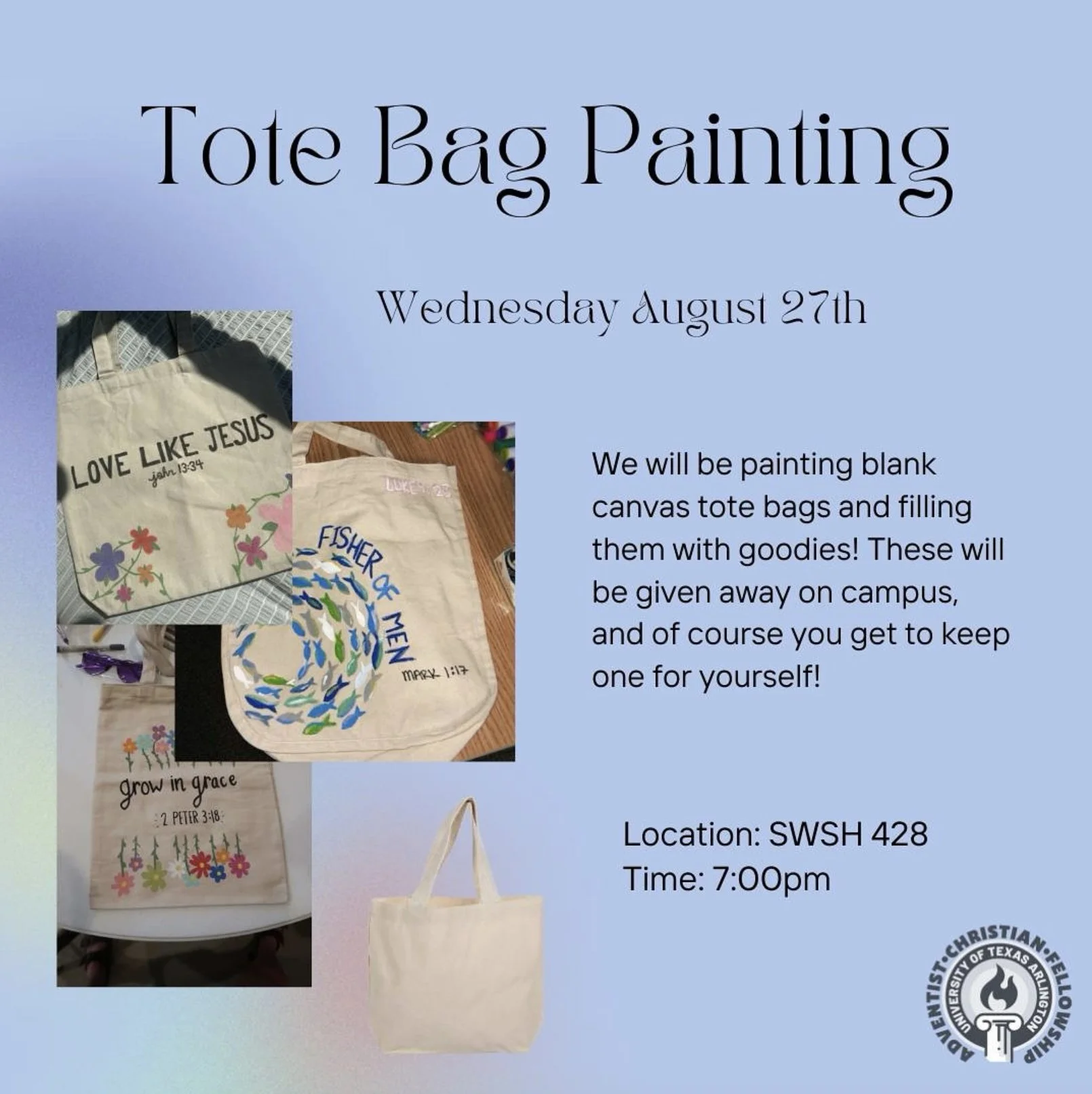 Join us Wednesday, August 27th @ 7PM for a creative and relaxing evening as we paint custom canvas tote bags and fill them with goodies for outreach on campus (and yes—you get to keep one too)! 🙌✨ Whether you’re artsy or just here for the snacks, it’s a chill way to connect with others and make something meaningful.📍Location: SWSH 428