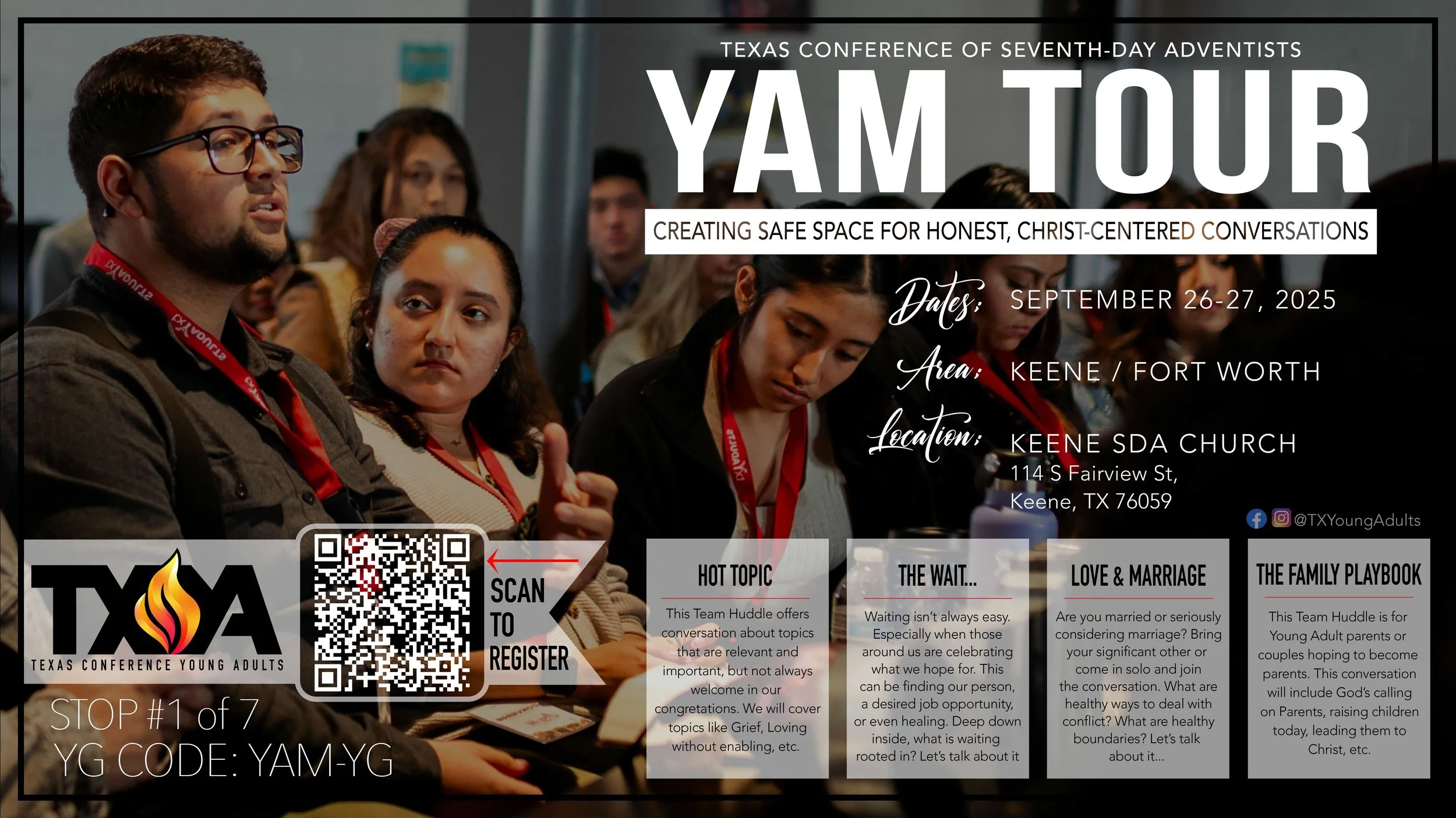 ATTENTION: YG Young Adults [ages 18-35]: TXYoungAdults has officially rolled out info for the YAM TOUR (Young Adult Ministry Tour), with the first stop coming to The Keene Church!