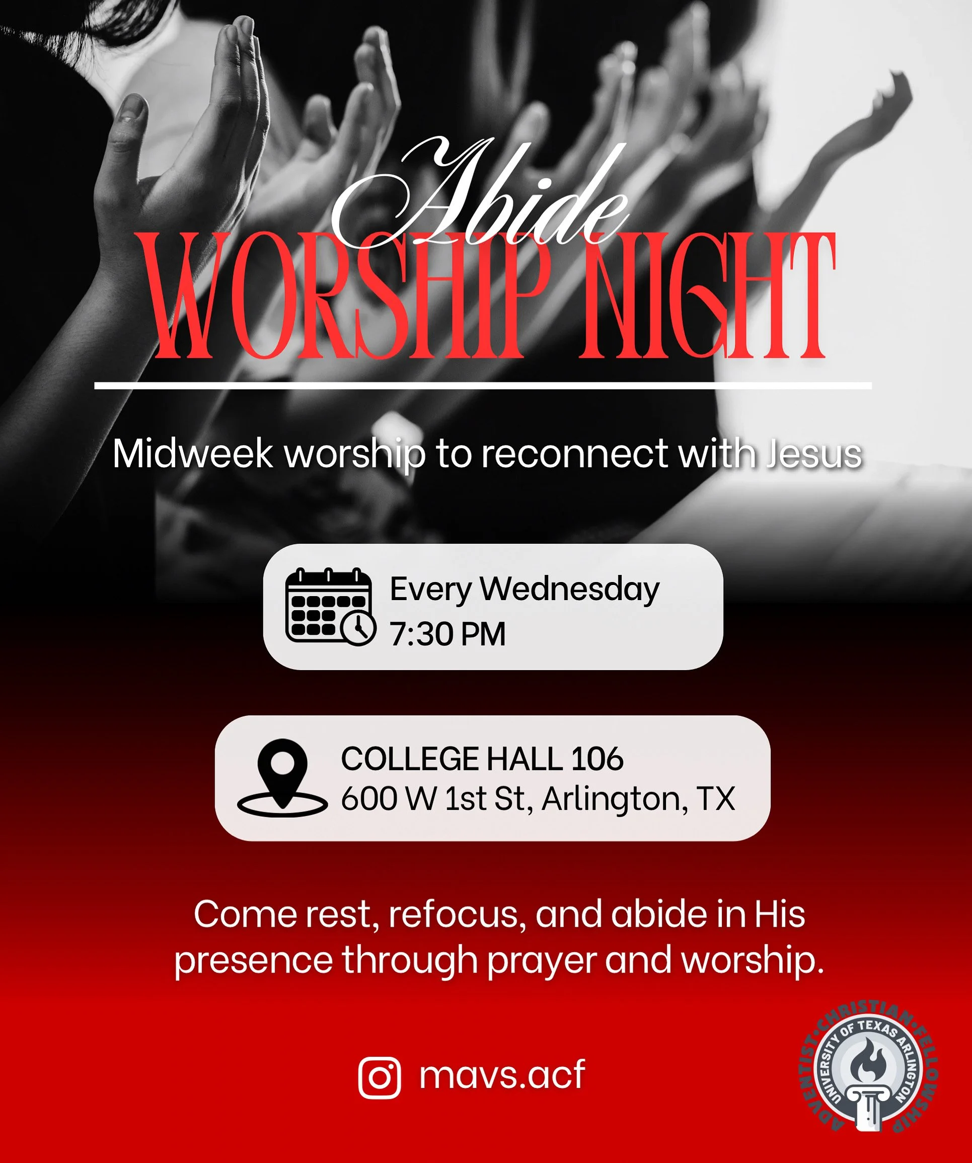 ABIDE WORSHIP NIGHT // THIS WEDNESDAY, 7:30PM // UTA COLLEGE HALL 106