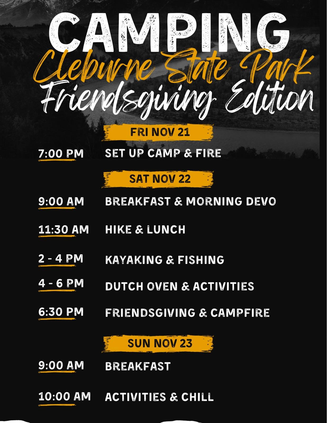 We’re going to run it back one last time this year on November 22nd, but this time a Friendsgiving Edition! You are all invited. We’ll be able to cook outdoors, either over fire & coals or on stoves. Come overnight or just for the day! Contact Melinda or Jasmin for more information. Click the above icon or here to sign up: bit.ly/txcamping