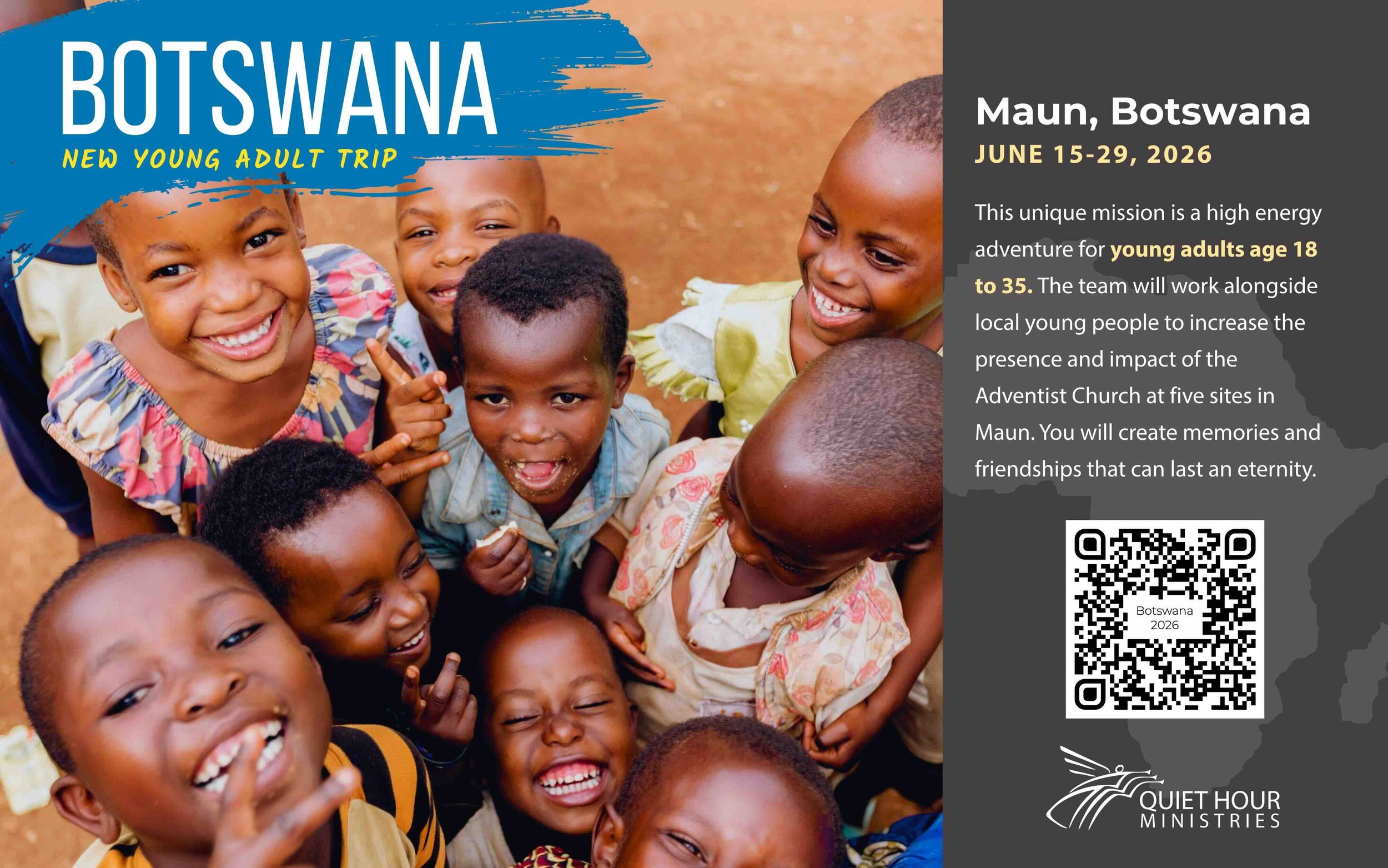 You are invited to join a mission to Botswana and see how God can work through you and other young adults to share His saving grace. Day assignments include helping at health clinics and visiting in the various neighborhoods along with the gospel workers who have started Bible studies in advance of our meetings. In the evenings, we will present a sermon series and a children's program. It is always rewarding to see the people we first meet at a clinic come to the nightly meetings and perhaps make a life-altering decision for Christ.